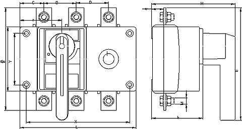 Compact switches – KS switches are made from 80 up to 630 Amperes as three-pole devices with double interrupting by pole and manual drive.